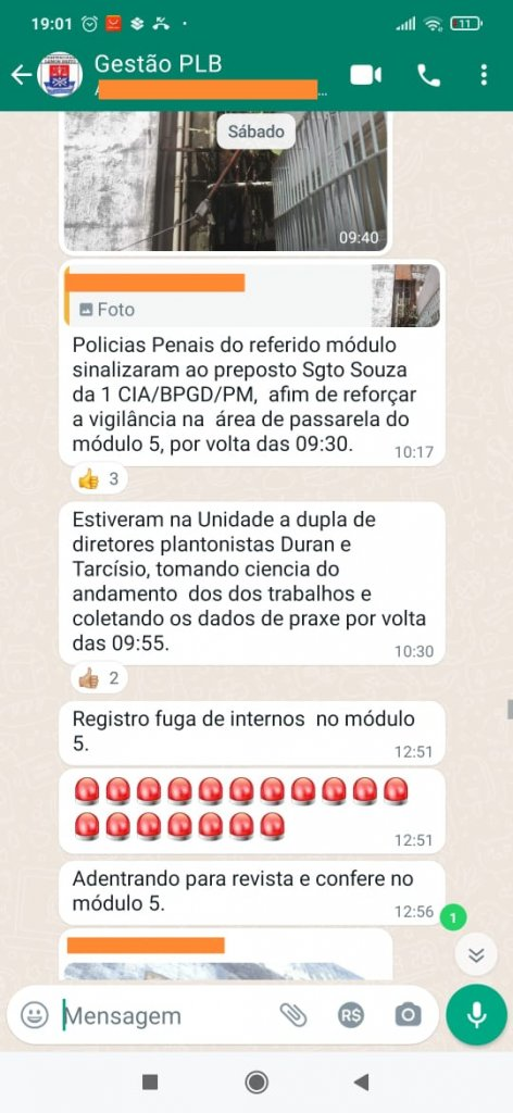 Prints de um grupo de mensagens interno comprovam a conversa do Coordenador do Módulo 5 avisando aos prepostos da 1ª CIA-BPGD sobre a movimentação atípica com antecedência.