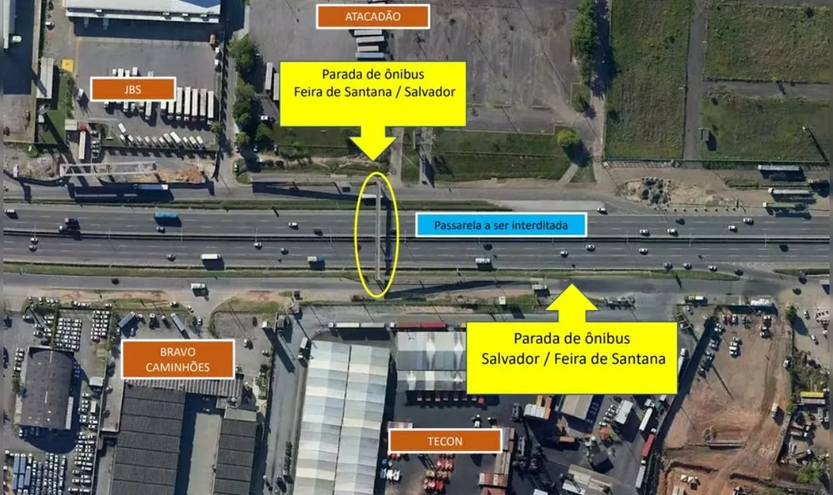 A passarela da Marginal Norte da BR-324, localizada entre os quilômetros 617 e 618 da rodovia federal, em Salvador, vai ser interditada por 30 dias para ampliação. O local vai ser interditado a partir das 22h desta terça-feira (19).