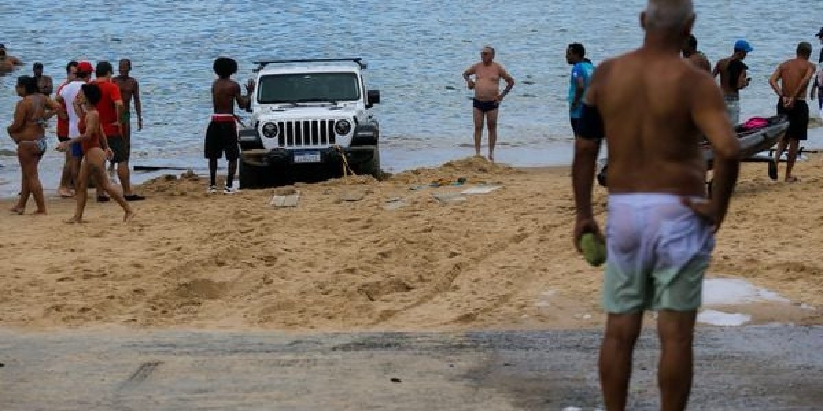 Um Jeep Wrangler ficou atolado na manhã desta segunda-feira (25) após descer a rampa da praia da Baía de Todos os Santos para pegar um jetski. O carro atolou na areia da praia ao tentar voltar para o cimento.