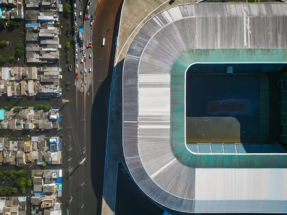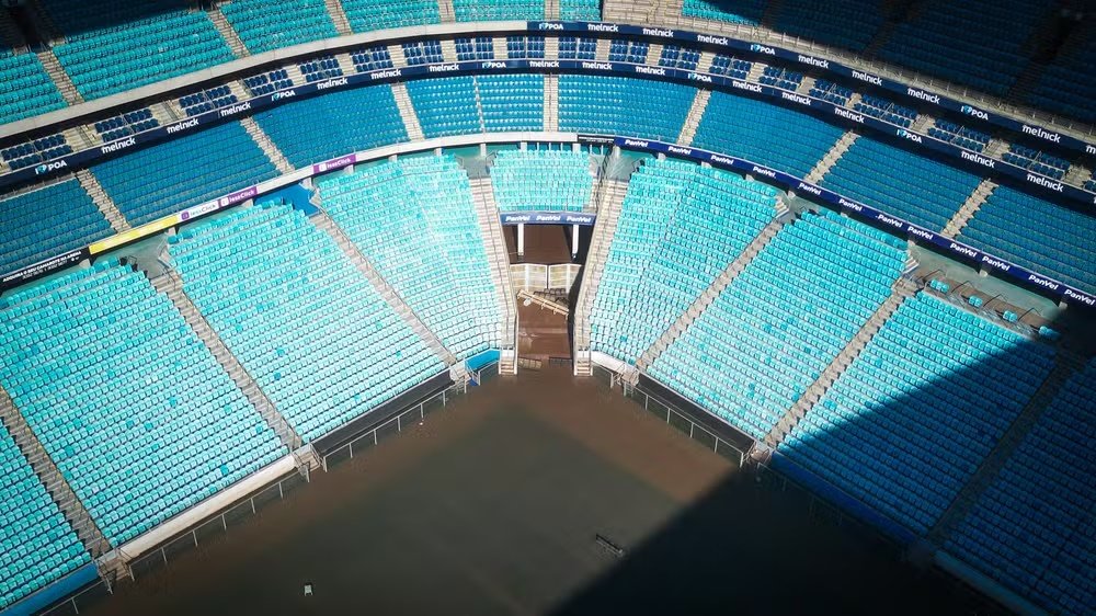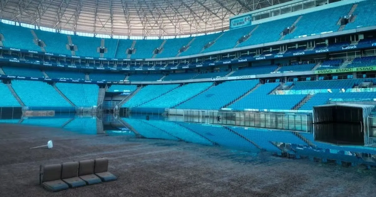 Após ficar alagado devido às enchentes que atingiram o Rio Grande do Sul, o nível da água da Arena do Grêmio começou a baixar. Parte do gramado já pode ser visto nas imagens feitas nesta terça-feira (21), assim como os estragos no estádio provocados pelo alagamento. Por exemplo, o banco de reservas foi parar no meio do campo.
