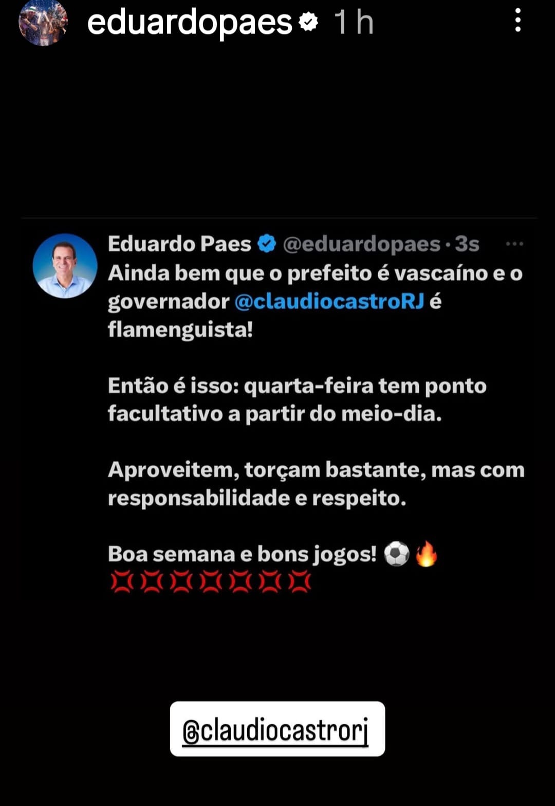 – Ainda bem que o prefeito é vascaíno e o governador@claudiocastroRJ é flamenguista! Então é isso: quarta-feira tem ponto facultativo a partir do meio-dia. Aproveitem, torçam bastante, mas com responsabilidade e respeito. Boa semana e bons jogos – publicou Eduardo Paes, para a alegria de torcedores do Flamengo e Vasco.